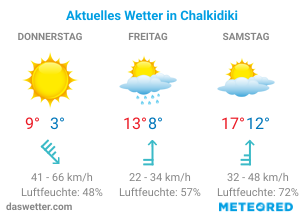 Mit über zehn Sonnenstunden pro Tag und 30°C Lufttemperatur, ist Chalkidiki als Sommerziel zu empfehlen. Im Sommer ist das Wetter sonnig und trocken.