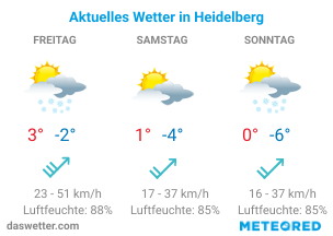 Allgemein fallen im Juli die meisten Niederschläge und der März ist in Heidelberg der trockenste Monat des Jahres. Aber auch zur kälteren Jahreszeit glänzt die Stadt in einem besonderen Licht. Einer der top Heidelberg Tipps: Gerade der Heidelberger Weihnachtsmarkt lässt einen romantischen Zauber entstehen.